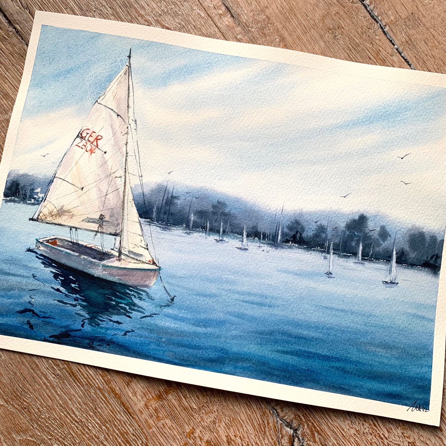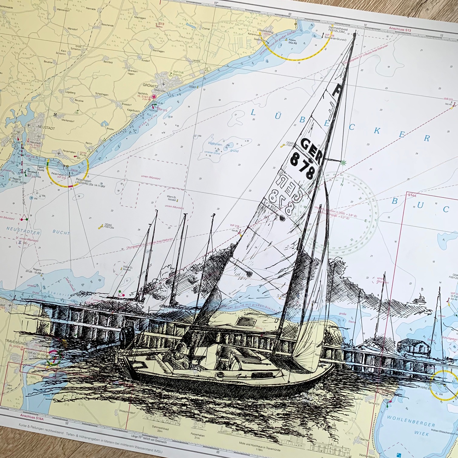 Diese Auftragsarbeit ist nach einem Foto auf einer Seekarte der Lübecker Bucht gezeichnet worden und ist dann zu einem 50. Geburtstag verschenkt worden.