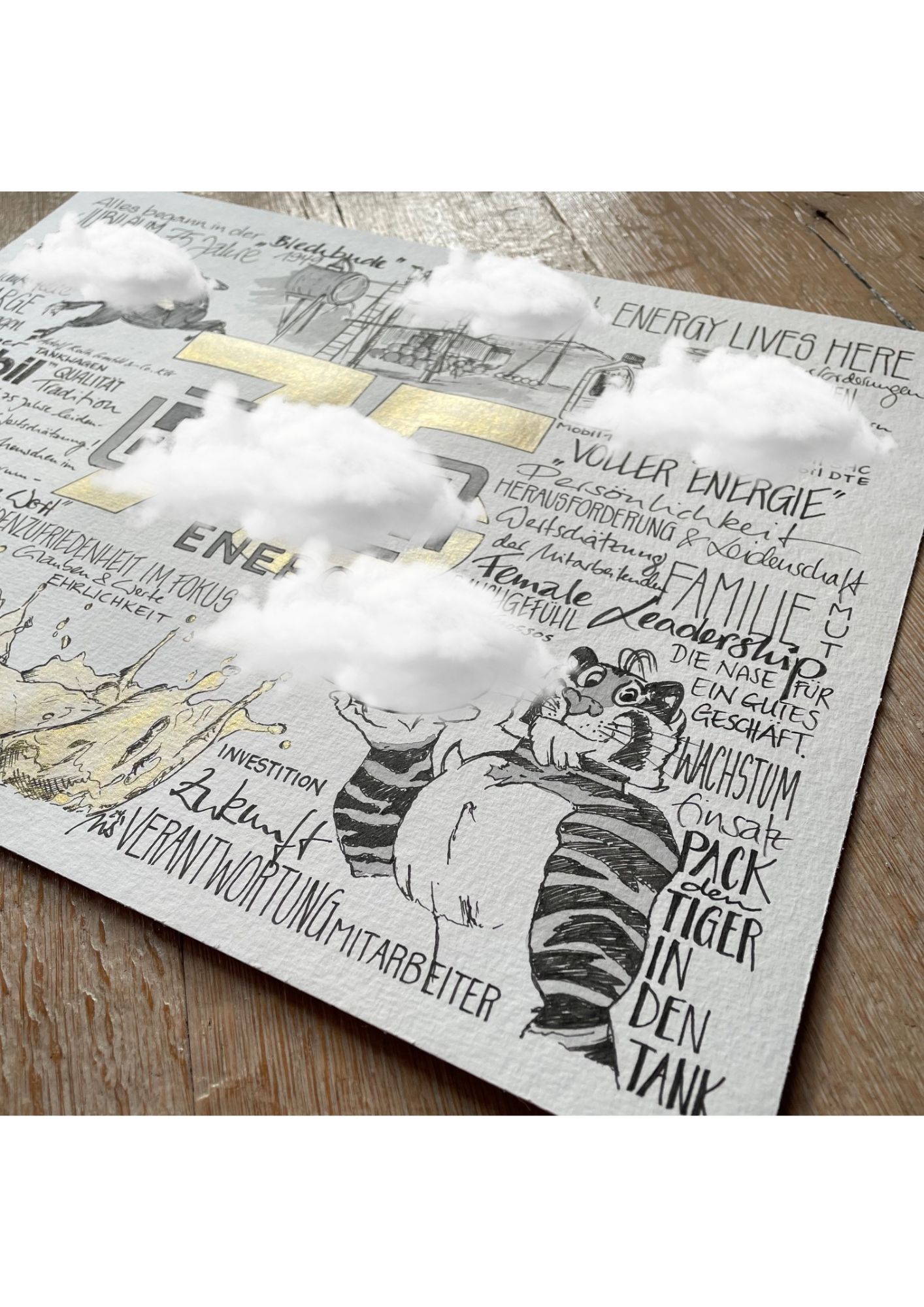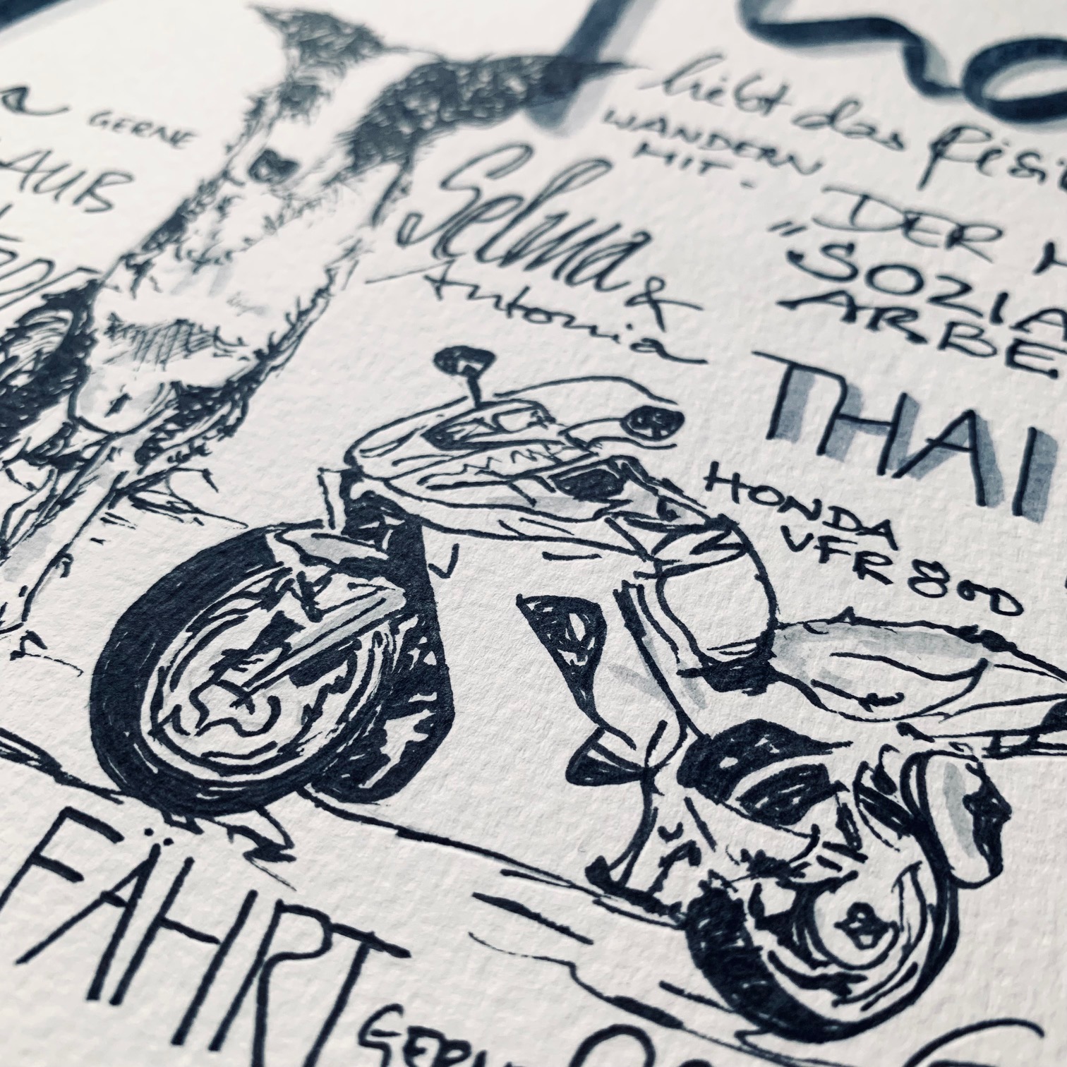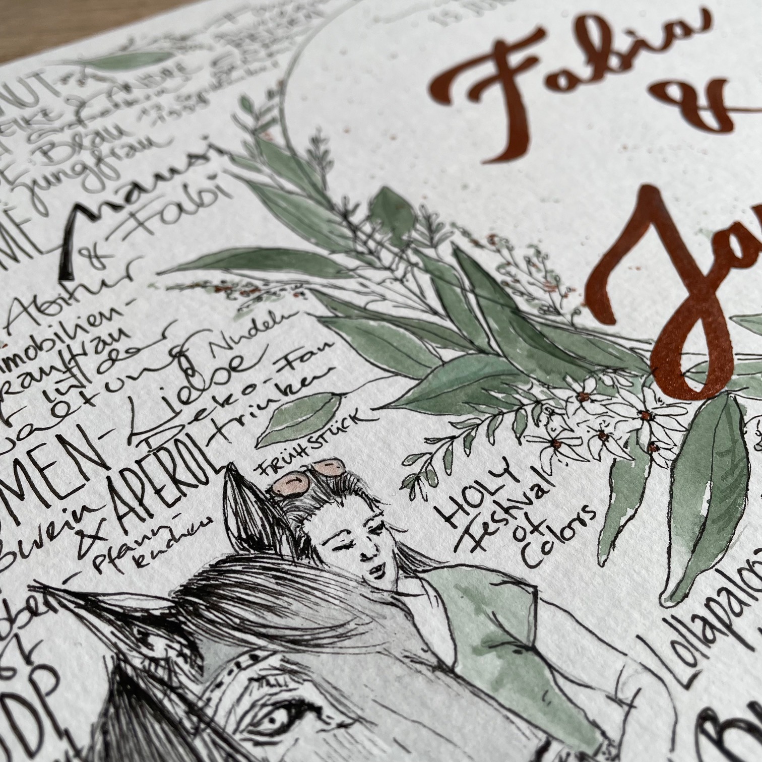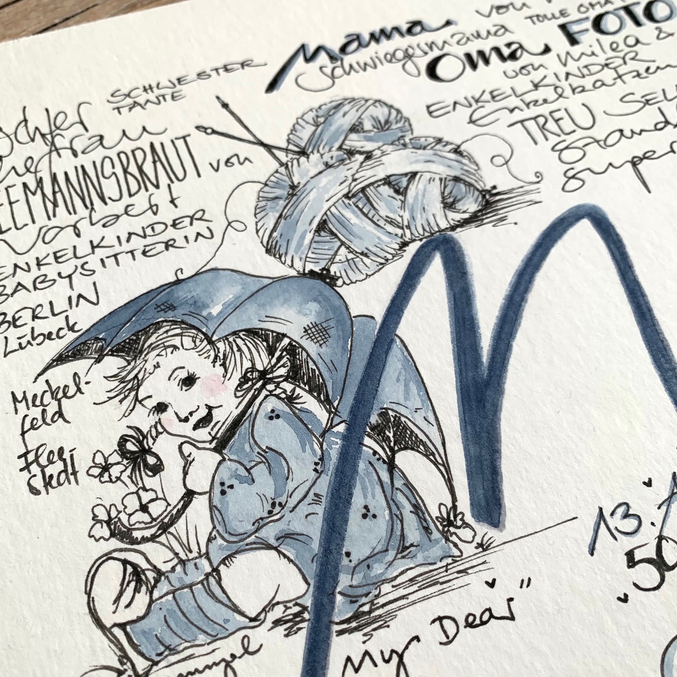 Diese Handlettering Collagen sind eine besondere Leidenschaft von mir. Ich liebe die Kombination aus Schriftgestaltung, Handlettering, Kalligraphie und Zeichnungen, die teilweise sogar mit Aquarellfarbe oder Brushpens farblich hervorgehoben werden. Sie erhalten hier immer ein ganz individuelles Original mit persönliches Stichworten, die der Kunde liefert. Dazu kombiniere ich zum Beispiel Zeichnungen von Gegenständen, Hobbies, Lieblingsspeisen, Reisezielen oder Ihren besonderen Wünschen. Ich habe diese Auftragsarbeiten bereits in kleinen und großen Formaten von DIN A5, DIN A4, DIN A3 und DIN A6 erarbeitet. Sie eignen sich als Hochzeitsgeschenke, besondere Geschenke für Jubiläen, Taufen, Geburtstage, Konfirmationen, Abschiedsgeschenke und vielseitige besondere Anlässe. Für diese Arbeiten benötige ich einen Vorlauf von ca. 4 Wochen ab Eingang der Stichworte. Da ich die Privatsphäre meiner Kunden schütze, darf ich in der Regel nur Ausschnitte der Collagen zeigen!