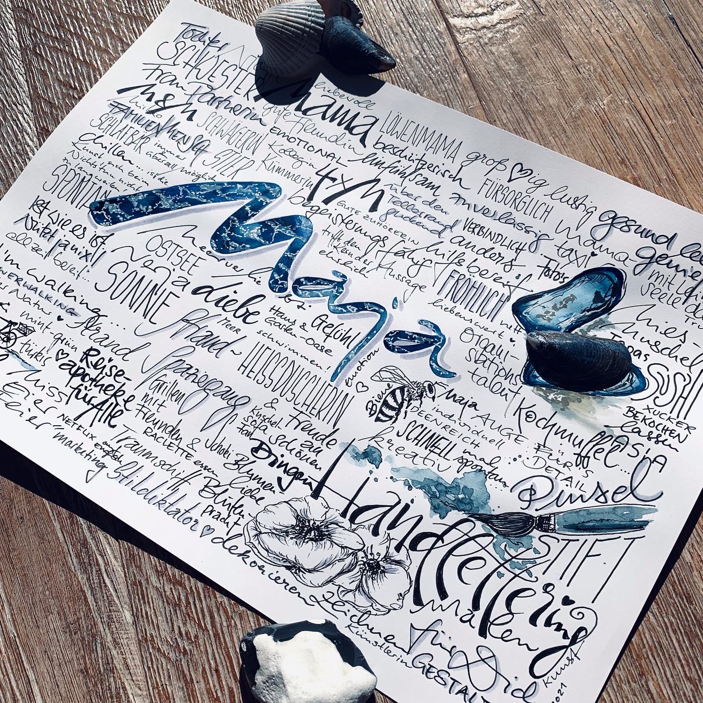 Handlettering Collagen sind eine besondere Leidenschaft von mir. Ich liebe die Kombination aus Schriftgestaltung, Handlettering, Kalligraphie und Zeichnungen, die teilweise sogar mit Aquarellfarbe oder Brushpens farblich hervorgehoben werden. Sie erhalten hier immer ein ganz individuelles Original mit persönliches Stichworten, die der Kunde liefert. Dazu kombiniere ich zum Beispiel Zeichnungen von Gegenständen, Hobbies, Lieblingsspeisen, Reisezielen oder Deinen besonderen Wünschen.